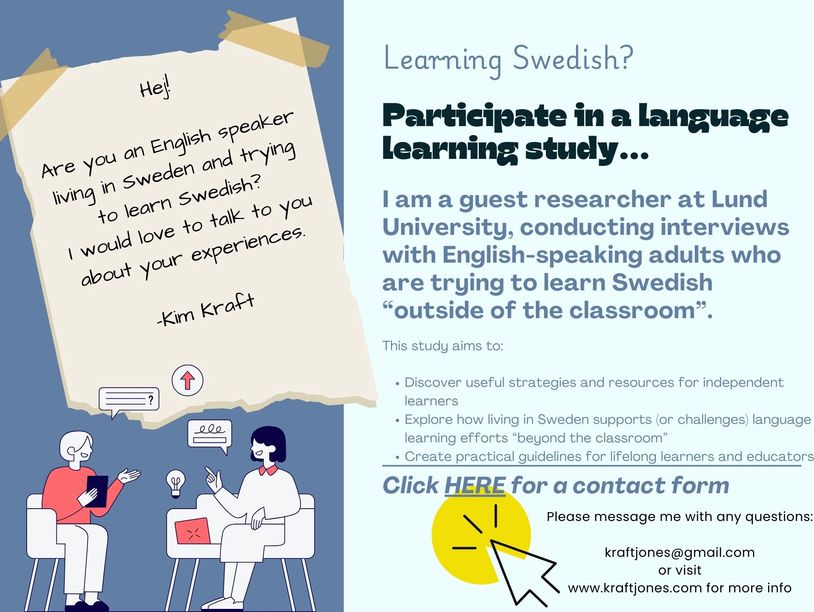 From October 2025 to June 2026, I hope to interview English speakers living in Sweden to learn about their experiences trying to learn Swedish. My goals are to: